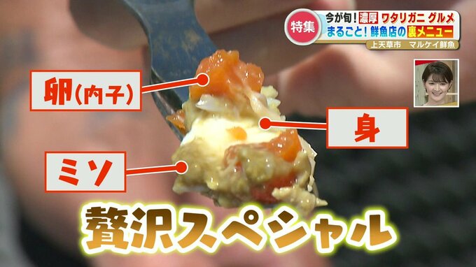 坂本アナ「身と卵とミソ。贅沢スペシャル!濃厚ですね。本当にうまみがたっぷり。カニというとタラバガニを想像してたんですけど、比べ物にならない!幸せです」