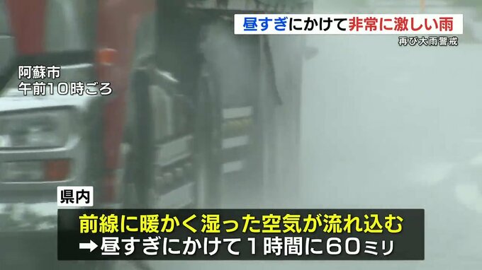 前線に暖かく湿った空気が流れ込んでいる影響で、熊本県内は、きょう昼過ぎにかけて局地的に1時間に60ミリの非常に激しい雨が降るおそれがあります。