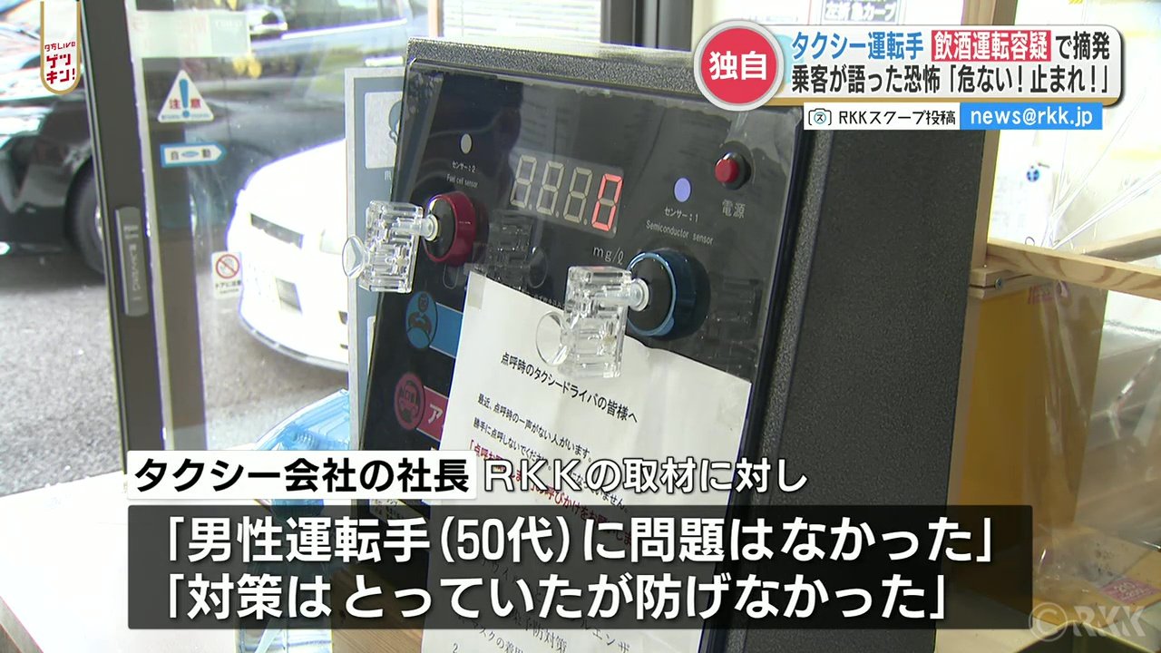 タクシー会社の社長はRKKの取材に対し、これまで男性運転手に問題はなかったとした上で「対策はとっていたが防げなかった」と話し、今後 警察の協力を得て講習を開くなど再発防止に努めたいとしています。