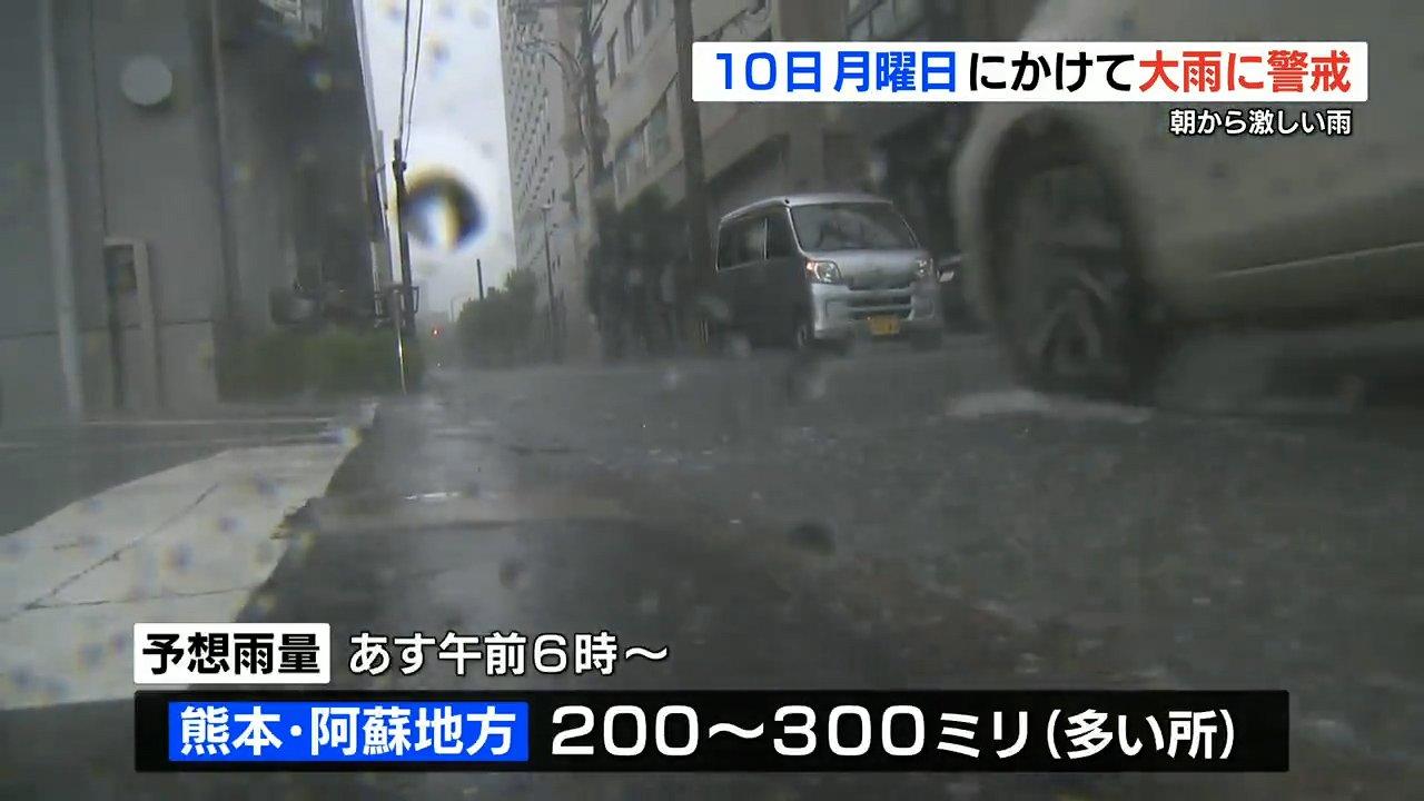梅雨前線の影響で、熊本県内は朝から激しい雨が降った所があり、気象台は、7月10日(月)にかけて大雨への警戒を呼びかけています。