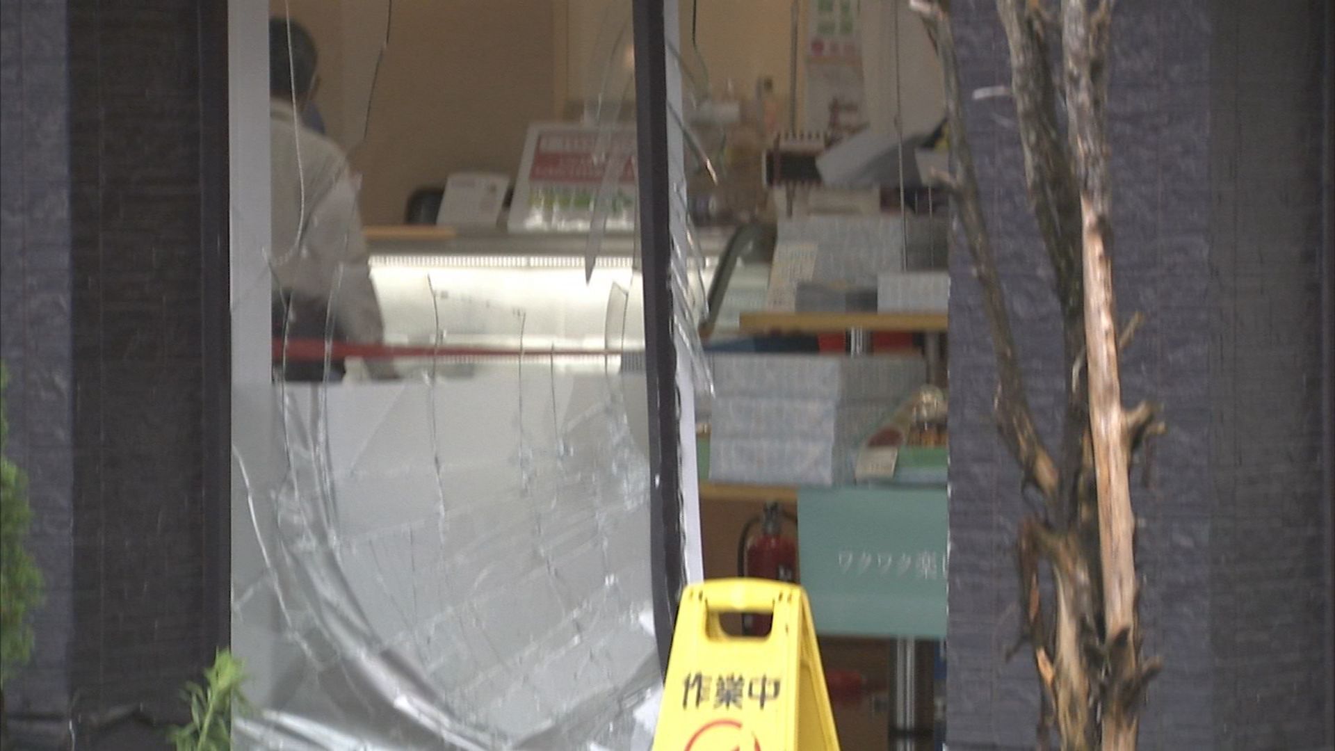 記者「軽乗用車はあちらの窓に頭から突っ込んだということです。右側のガラスはほとんどなくなっています。」