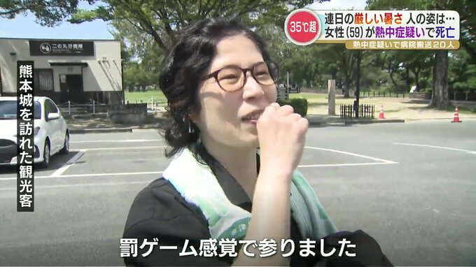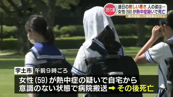 宇土市では午前9時ごろ、59歳の女性が熱中症の疑いで自宅から意識のない状態で病院に運ばれその後死亡しました。今月、県内で熱中症の疑いで亡くなった人は初めてです。