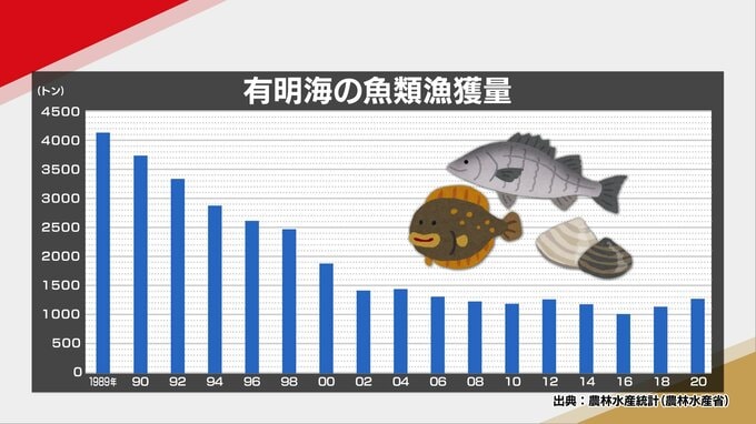 農林水産省によりますと、有明海の漁獲量は、30年以上前の1989年では4000トンを超えていました。(1989年 4115トン)