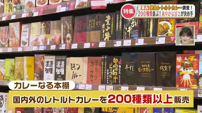 キタノエース 平田律会さん「こちらがキタノエースの代名詞『カレーなる本棚』です。日本全国・世界各地のご当地レトルトカレーや変わり種カレーを200種類以上を集め、本棚のように並べたコーナーです」