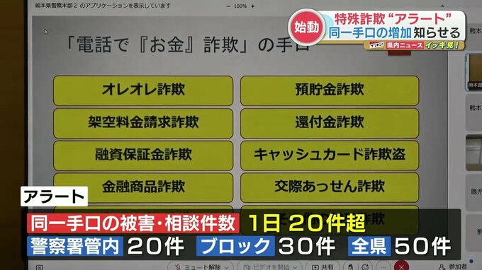 熊本県警によりますと、県内の特殊詐欺被害は2021年から増加傾向で、今年6月末の時点で、去年の同じ時期より5件多い、64件の被害が確認されています。