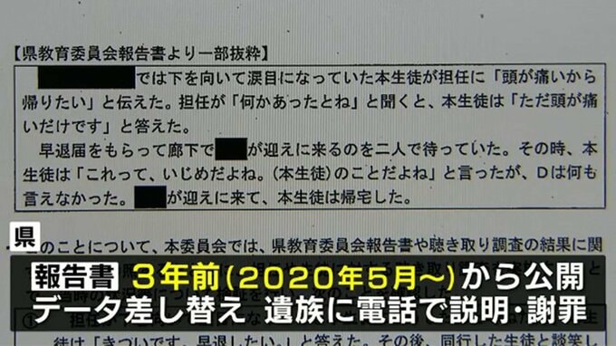 【いじめ報告書マスキング問題】県北高校女子生徒 自殺問題の黒塗り部分も約3年間閲覧できる状態で公開していた 遺族がコメント 熊本 2023年8月7日(月) 18:56 国内 熊本県の教育委員会がホームページで公開した、いじめに関する報告書の黒塗りの部分が閲覧できる状態だった問題で、別の報告書では、約3年間同じ状態だったことが明らかになりました。熊本県教育委員会は8月、ホー…