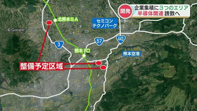 【TSMC進出に伴い誘致を】「3つのエリアを企業集積地に」半導体の産業用地を整備へ 熊本市 2023年8月7日(月) 18:00 国内 半導体関連産業の誘致を進める熊本市は将来に向けた企業集積地として3つのエリアを示し、その整備を担う事業者を決定しました。企業集積エリアとして整備が進められるのは熊本空港線沿線や国道443号沿線の2つのエ…