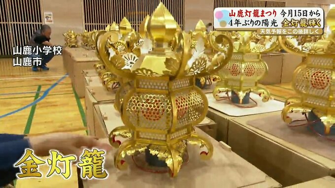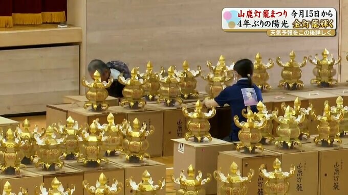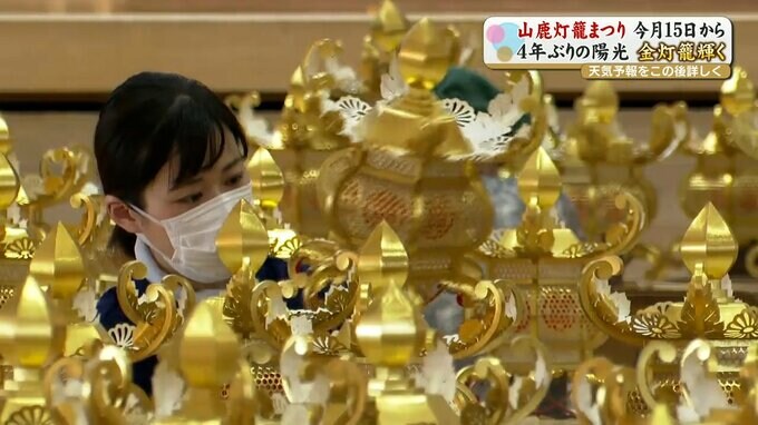 新型コロナウイルスの影響で4年ぶりに陽の光を受けて輝く金灯籠。