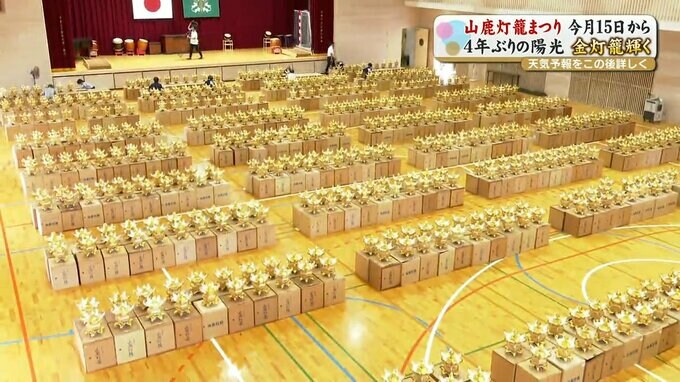 山鹿小学校の体育館には8月15日から始まる山鹿灯籠祭りのハイライト、「千人踊り」で使われる金灯籠がずらりと並べられました。