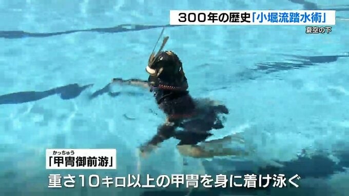 一番の見せ場は、重さが10キロ以上ある甲冑(かっちゅう)を身に着けて泳ぐ「甲冑御前游(かっちゅうごぜんおよぎ)」です。