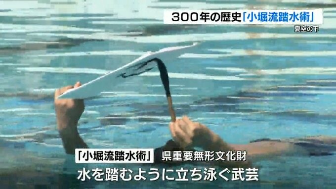 熊本の重要無形文化財に指定されている「小堀流踏水術(こぼりりゅうとうすいじゅつ)」は、水を踏むように立ち泳ぐ武芸で、300年の歴史があります。