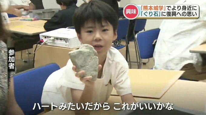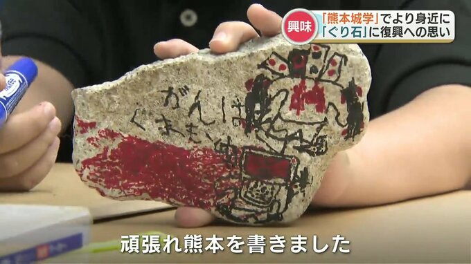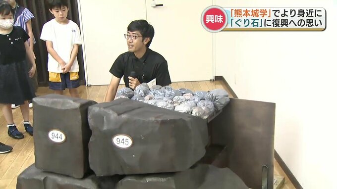 模型を使った石垣の説明にも興味津々の子どもたちは、今後の復旧作業で使われる「ぐり石」に復興への思いを込めました。