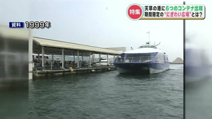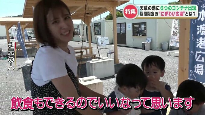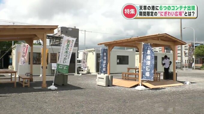 天草市に7月、突如として現れた6つのコンテナ。グルメや体験コーナーを宣伝するのぼりも並んでいます。