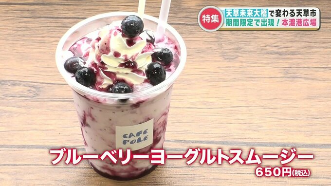 年内に、旅館の中にもカフェを作る計画があり、その足がかりにしようと店を始めました。天草産のブルーベリーをたっぷり使ったイチオシのスムージーを中心に 25種類のドリンクメニューがあります。