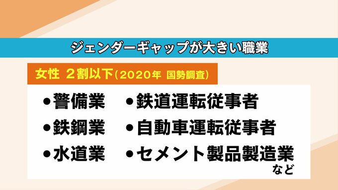 警備業や鉄鋼業、鉄道運転従事者などは「働く人のうち女性の割合が2割以下の職業」です。