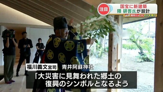 9月1日は竣工式が行われ、福川義文宮司が「大災害に見舞われた郷土の復興のシンボルとなるよう、気を引き締めて育てていかなければならない」と思いを語りました。