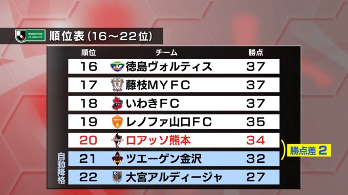 順位表です。ロアッソ熊本は、勝ち点34の20位で、J3への降格圏となる21位「ツエーゲン金沢」との勝ち点差は「2」です。