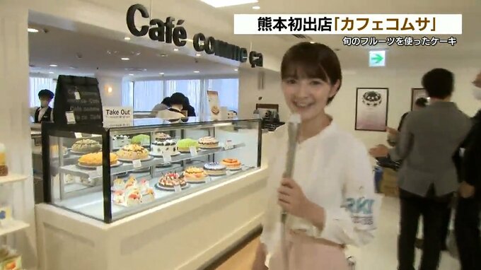 後生川凜アナウンサー「婦人服売り場を進んでいくと見えてくるのが…今日オープンした『カフェコムサ』です。きらびやかなケーキがショーケースに並んでいます」