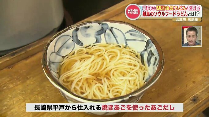 細麺の五島うどんは、表面に椿油を塗ることで、つるりとした喉越しの良い麺に仕上げ、長崎県平戸から仕入れた焼きあごを使った自家製のあごだしを加えているのがポイントです。