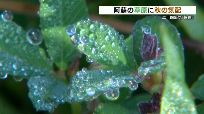 草千里では、草に降りた朝露がいくつもの水玉になって、美しい景色を作りだしていました。