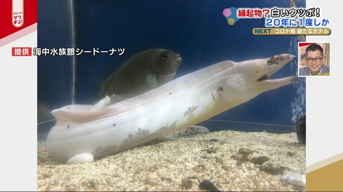激レア!目撃例は20年に1度?長い体を持つあのサカナの真っ白な変異種 縁起がいいかどうかは不明 2022年6月17日(金) 11:00 国内 ■神秘的?縁起物?白い〇〇〇 2021年11月に熊本県の牛深(うしぶか)で漁師さんが見つけたのは・・・なんと白い「ウツボ」 海中水族館シードーナツの魚類担当、大橋さんによりますと、このように白くなるのは「白変種」と呼ばれる突然変異で、10万分の1以下の確率とも言われているそうです。 九州では2016年に長崎で発見されて以降報告はなく、漁師さんも20年ぶりに見たと話していたそうです。 大橋さんは勝手に「白ちゃん」と呼んでいるらしい ちなみに、シードーナツでは白変種の水槽を作っていて、白いナマコも展示されているということです。
