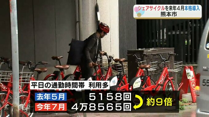 熊本市では去年4月、「Charichari(チャリチャリ)」を使った実証実験を始めましたが、平日の通勤時間帯を中心に利用が多く、約1年半で、全体の利用回数は約9倍に増えています。