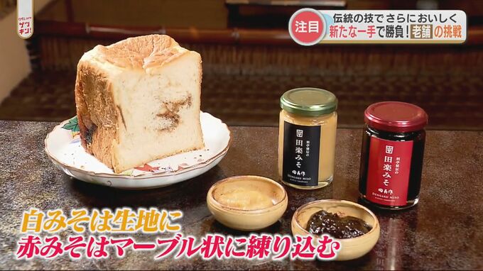 白味噌は生地へ赤味噌はマーブル状に練り込んでいます。香りと味を際立たせる為、焦げ目がつくまでしっかりめにトーストするのがオススメの食べ方だそうです。