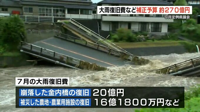 大雨からの復旧費 『119億6800万円』エネルギー価格高騰の緩和策、赤潮被害支援や豚熱の対策強化など 『合計 約270億円』の補正予算案可決 熊本県議会閉会 2023年10月6日(金) 12:08 国内 9月定例県議会は、約270億円の補正予算案を可決し、閉会しました。可決された270億2000万円のうち、最も多かったのが今年7月の大雨からの復旧費で、その額は119億6800万円です。具体的には崩落した山都町(やまと…