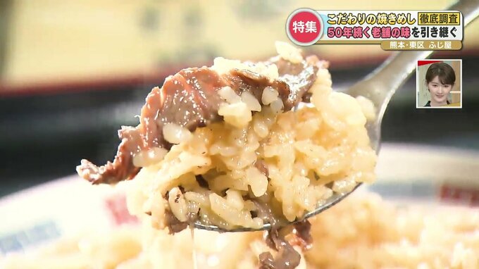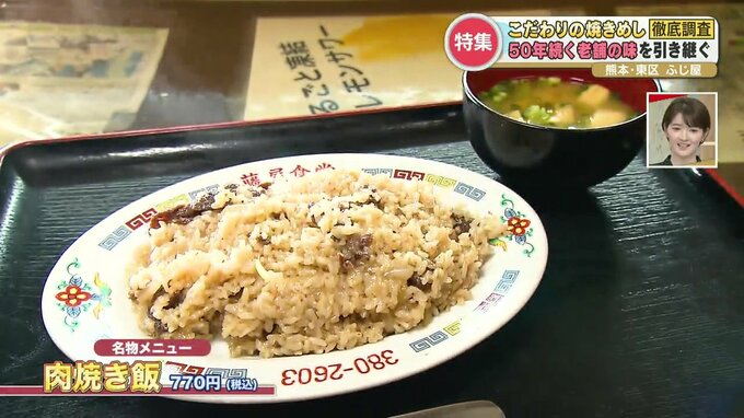 まずは、熊本市東区にある『ふじ屋』。創業から3代に渡って50年以上続く人気店です。創業当時から変わらない名物の焼きめしは、お肉がたっぷりと入った、「肉焼き飯」。