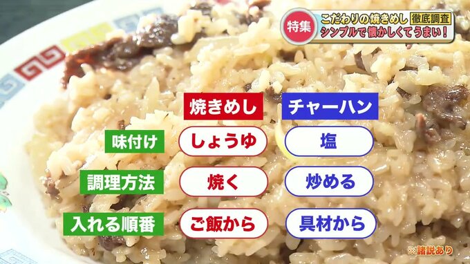 焼きめしは「しょうゆ」で味付けするのに対し、チャーハンは「塩」で味付け。「焼く」のが焼きめしで、「炒める」のがチャーハンです。