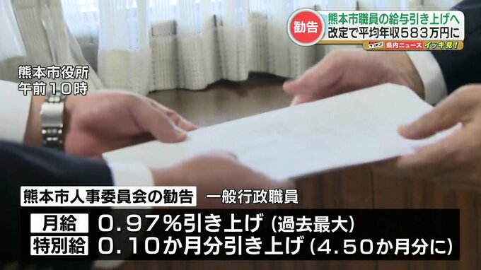 熊本市人事委員会は、一般行政職員の月給を過去最大となる0.97パーセント引き上げ、ボーナスにあたる特別給も0.10か月分引き上げるよう求めました。