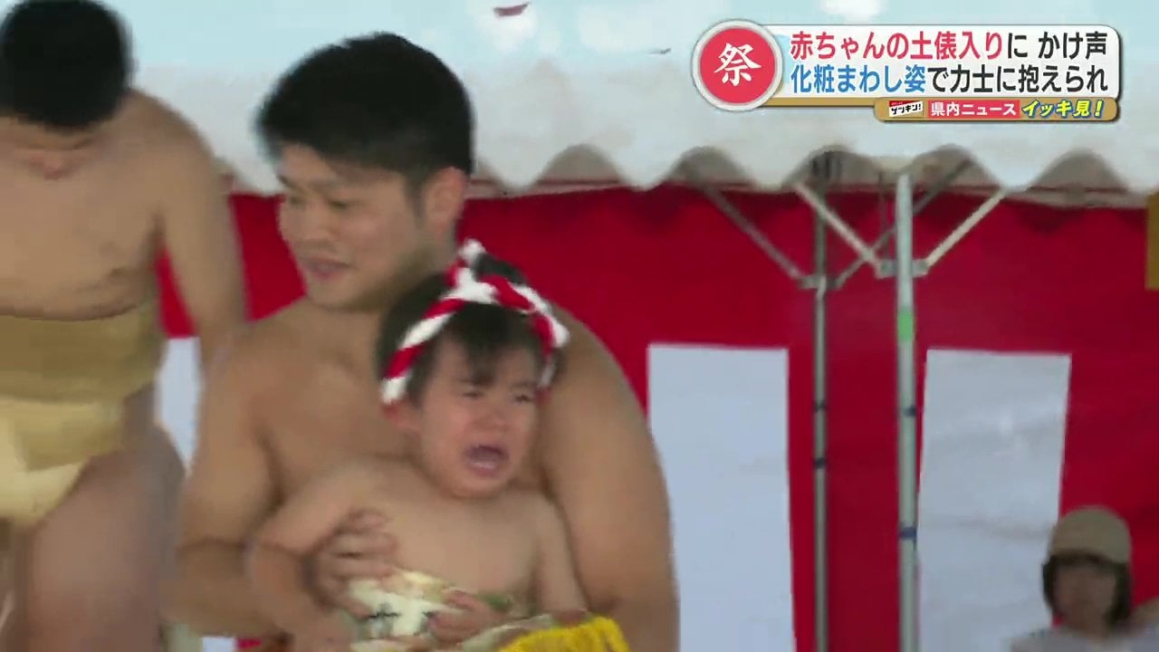 化粧まわしにねじり鉢巻姿で登場した赤ちゃん、中には大人の力士に抱えられ泣きだす子もいました。