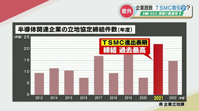 県内の過去10年間の半導体関連企業の立地協定件数を見ると毎年10件前後締結されていましたが、TSMCが進出を表明したおととしは22件と過去最高に。