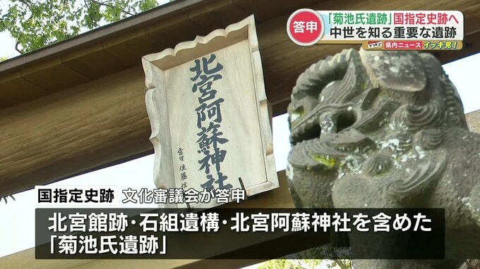 国の文化審議会が「国指定の史跡」とするよう文部科学大臣に答申したのは、菊池市の深川・北宮地区にある北宮館跡(きたみや やかたあと)と石組遺構(いしぐみ いこう)、そして北宮阿蘇神社を含めた「菊池氏遺跡」です。