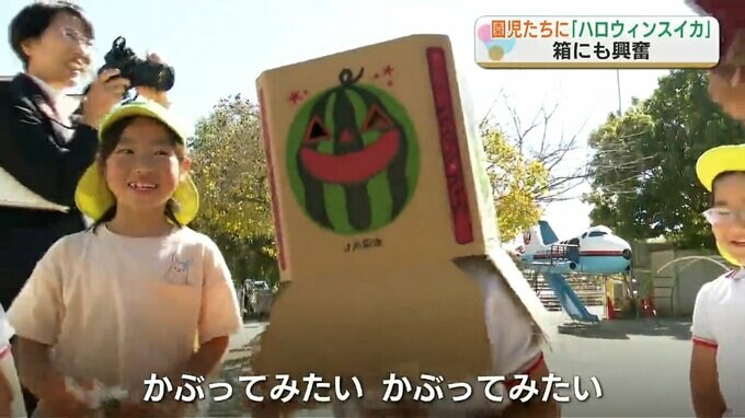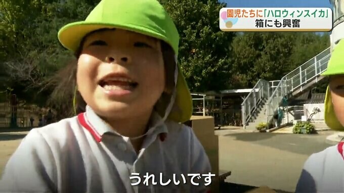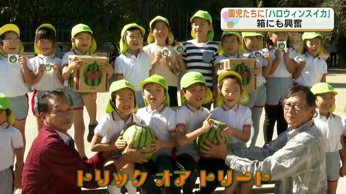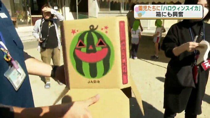 子どもたちにハロウィンの気分を楽しんでもらおうと4年前から毎年贈られていて、園児たちはスイカだけでなく、ハロウィンをイメージしたスイカの箱も気に入ったようでした。