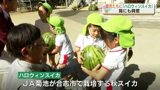 ハロウィンスイカとは、JA菊池が合志市で栽培する秋スイカで、今回、合志市の園児に4玉がプレゼントされました。