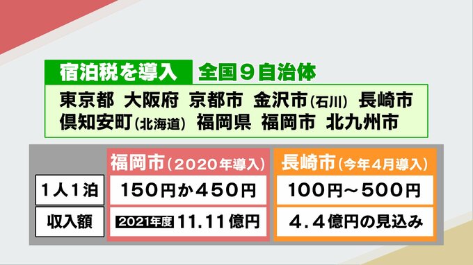 福岡市は1人1泊につき、150円か450円。2021年度の税収額は11億1100万円です。長崎市は年間で4億4000万円の税収を見込んでいます。