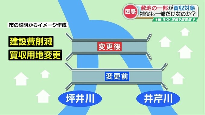 市の説明は「建設費削減のために橋の長さを短くしたい。それに伴って買収する用地が変更になった」というものでした。