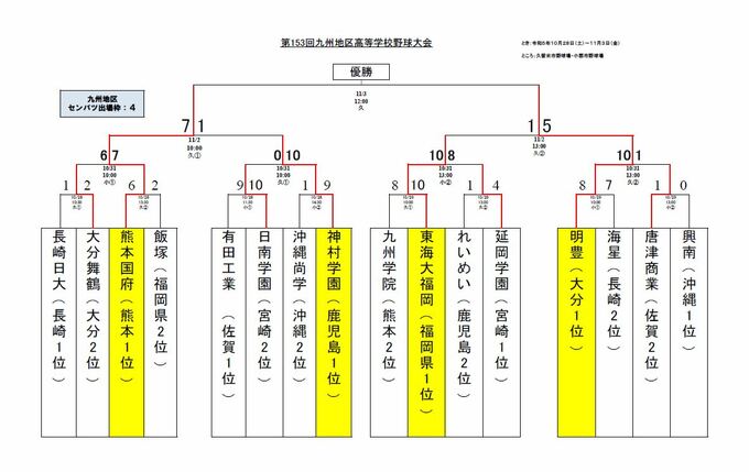 また、強豪同士の明豊(大分1位)と東海大福岡(福岡1位)は、5ー1で明豊が勝利し決勝進出を果たしました。九州地区からは4チームが選出される予定です。