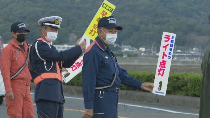 2日夕方、熊本県天草市の国道では、警察官たちが早めのライト点灯や反射材の着用などを呼びかけました。