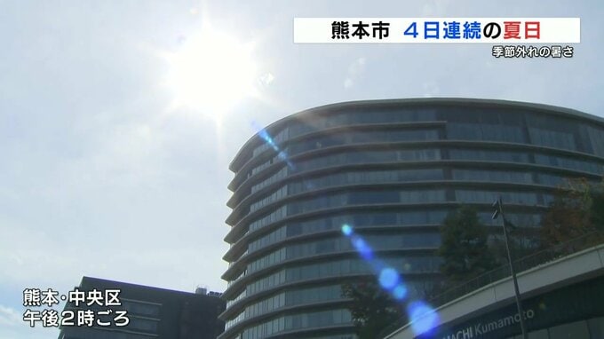仮装イベントも大変 熊本市4日連続の夏日 2023年11月4日(土) 17:03 国内 11月にも関わらず熊本県内は各地で25℃以上の夏日となりました。最高気温は、甲佐町で27.4℃、熊本市で27.0℃まで上がりました。戦隊ヒーローの衣装を身につけた仮装イベントの参加者も暑さを実感していました。「…