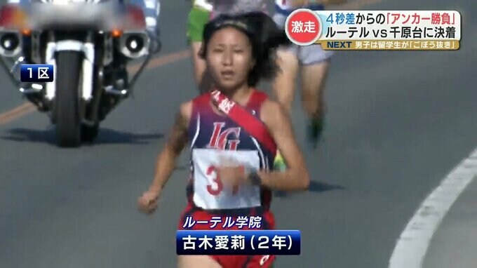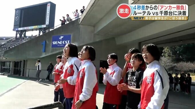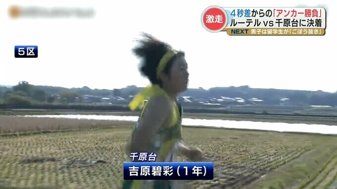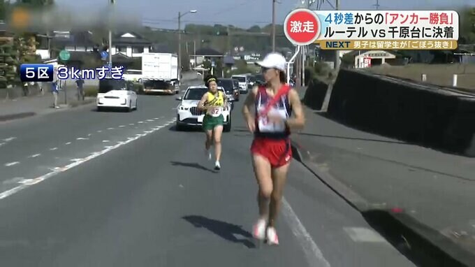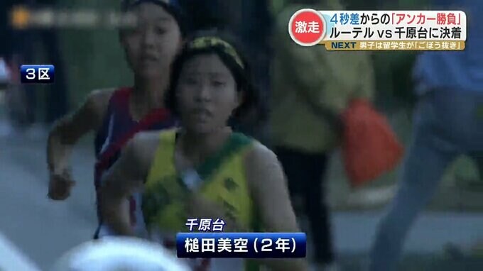 まずは1区でルーテル学院の古木愛莉(ふるき あいり)が2位に17秒の差をつけます。しかし3区で千原台の槌田美空(つちだ みく)が先頭のルーテル学院を捉え、勝負の行方は4秒差でアンカーへ。