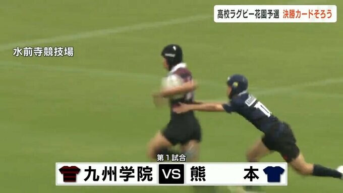 前半から九州学院がパスで展開するラグビーで連続トライ。