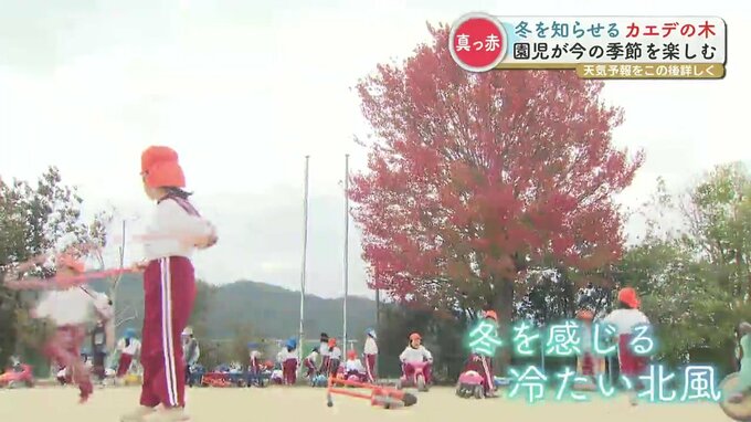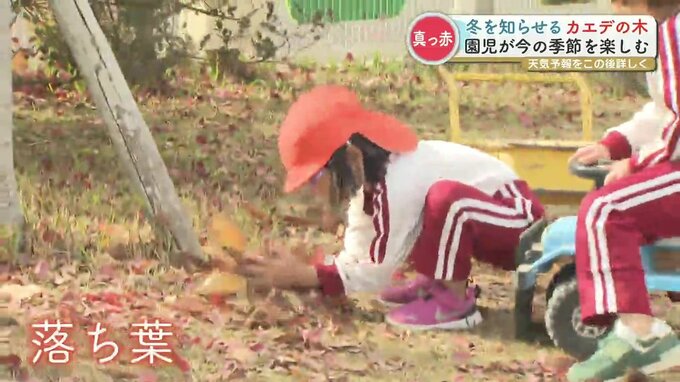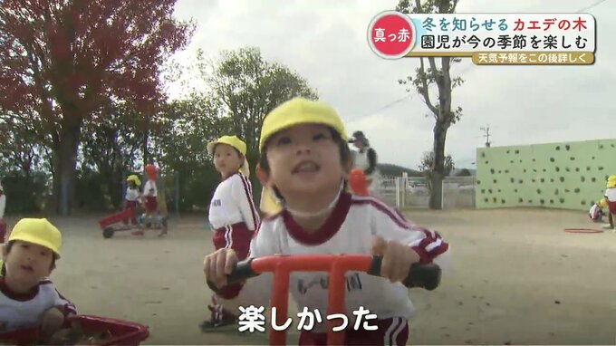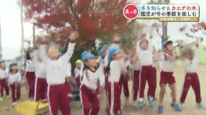 真っ赤に色づいたカエデの木の下では、子どもたちが今の季節を楽しんでいました。