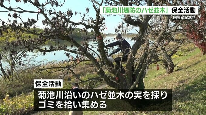 国登録記念物 ハゼ並木の清掃・保全活動 熊本県玉名市 2023年11月26日(日) 11:48 国内 国の登録記念物「菊池川堤防のハゼ並木」の保全活動が熊本県玉名市で行われました。保全活動には地元の住民など40人が参加し、菊池川沿いのハゼ並木の実を採りゴミを拾い集めていました。玉名市のハゼ並木は江戸時…