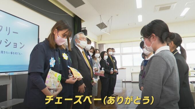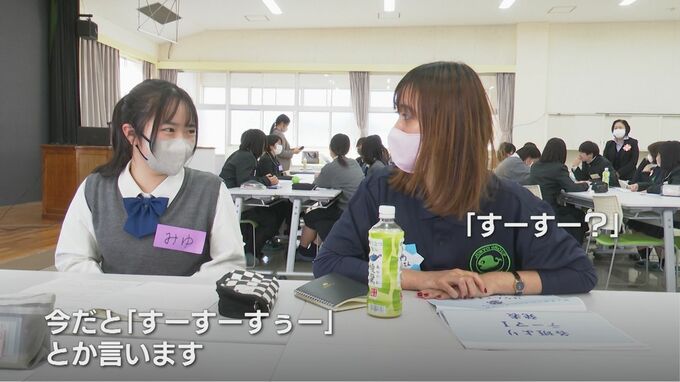 福祉を学ぶ生徒たちに介護・福祉業界で増える外国人人材への理解を深めてもらおうと企画されたこの交流会。生徒たちは実習生にいまの時期ならではの方言を教えました。