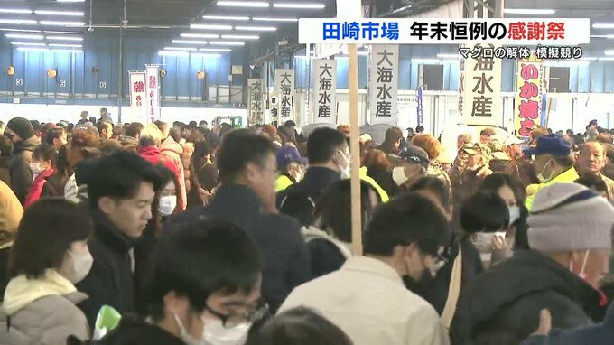 熱気に包まれた田崎市場感謝祭 2023年12月3日(日) 12:19 国内 熊本市の田崎市場で、年末恒例の感謝祭が開かれました。4年ぶりに開かれた田崎市場の感謝祭。新鮮な魚や野菜などが安く販売され、前に進めないほどの大勢の人でにぎわいました。なかでも、注目されたのがマグロの…