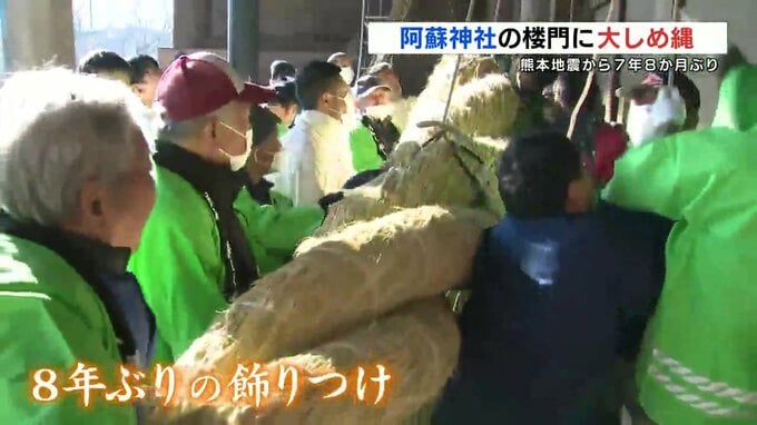 阿蘇神社の楼門に“7年8か月ぶり”大しめ縄で再建祝う 熊本地震による倒壊から復興へ 2023年12月4日(月) 12:13 国内 熊本地震で倒壊し再建された阿蘇神社の楼門に、7年8か月ぶりに大しめ縄が飾り付けられました。阿蘇神社の楼門は熊本地震で倒壊しましたが、その後再建され、12月7日に完成を祝う竣工祭が行われます。楼門には地震…