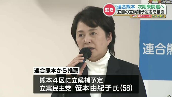 「一刻も早く、戦う体制を整えたい」連合熊本が立憲民主党・笹本由紀子氏を推薦 次期衆院選で熊本4区に立候補を予定 2023年12月15日(金) 18:59 国内 連合熊本は、次期衆院選に向けて立憲民主党が擁立した笹本由紀子(ささもと ゆきこ)さんの推薦を決めました。連合熊本から推薦を受けたのは、次期衆院選で立憲民主党から、熊本4区に立候補を予定している笹本由紀…