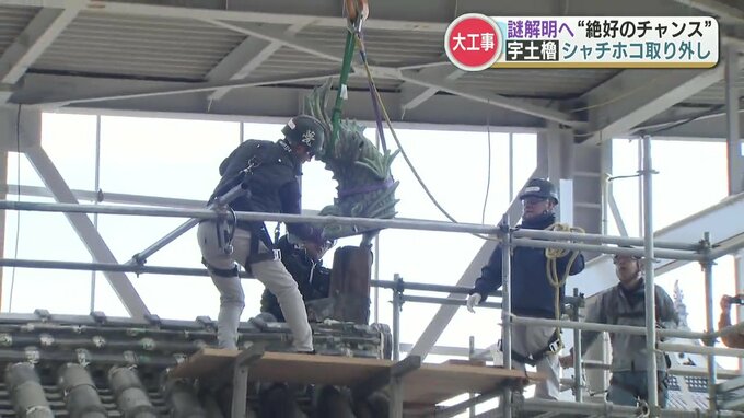 9年に渡る大工事に向け、宇土櫓を囲うように足場が組まれていますが、きょうその内部で最初の工程が始まりました。それが、鯱(しゃちほこ)の取り外しです。